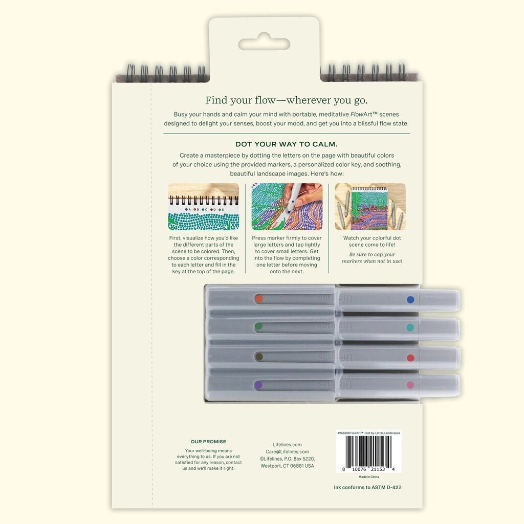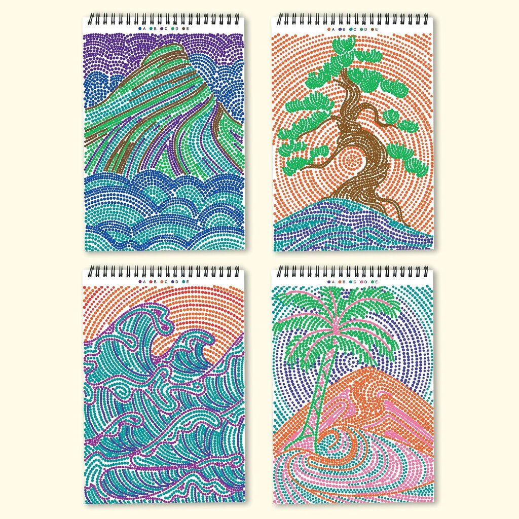 Dot-by-Letter includes 20 meditative scenes and four double-sided markers in a detachable storage tray. Engage in a meditative dotting activity using a guided letter key to fill the page with vibrant dots, creating beautiful scenes. Simply match the colors to the letters, and let the rhythmic motion of dotting bring you a sense of calm. Compact and portable, this pad is perfect for calming your mind on-the-go, unwinding before bed, or taking a work or study break to de-stress.