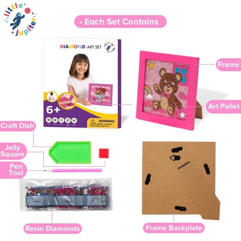 How Does It Work? Each set includes a themed canvas art with a plastic film & a sticky design surface. As you peel back the film, you will see various symbols. You simply use the pen tool to stick into the jelly glue. Then use the pen tool to place the correct colors to the sticky canvas art for a dynamic sparkling brilliance that will delight! Complete the set and feel a sense of achievement & attention to focus. Diamond painting for kids helps children with puzzle solving & creativity development. Everything You Need for The Perfect Gift Each kit includes a 7 1/8 x 7 1/8” colored wooden frame with kickstand, canvas art, plastic pen tools, resin colored diamond bags, jelly glue, & tray.