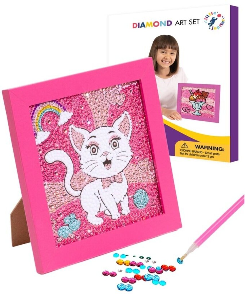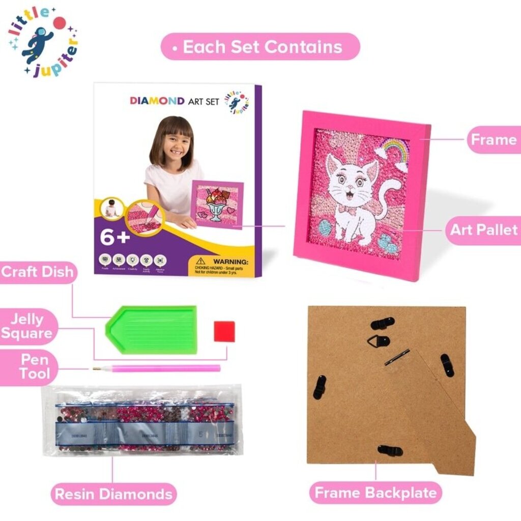 Are you looking for a great way for kids to pass the time? Perhaps something that unlocks a child’s creativity? Rainy day project that requires focus? A gift? Look no further than the Little Jupiter Diamond Art Set. A wooden canvas art set similar to paint by number projects. The perfect beginner set for kids 6 years and up. Average build time is 2+ hours. Kids will love the end result from their hard work.